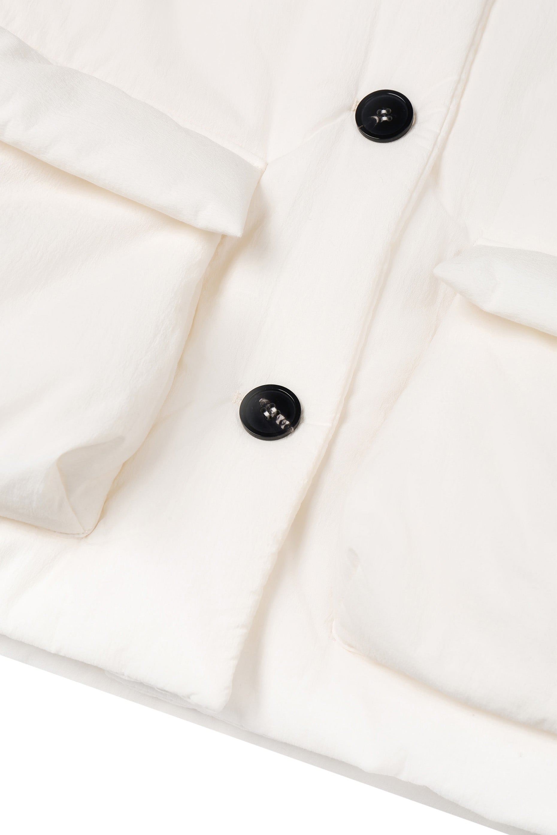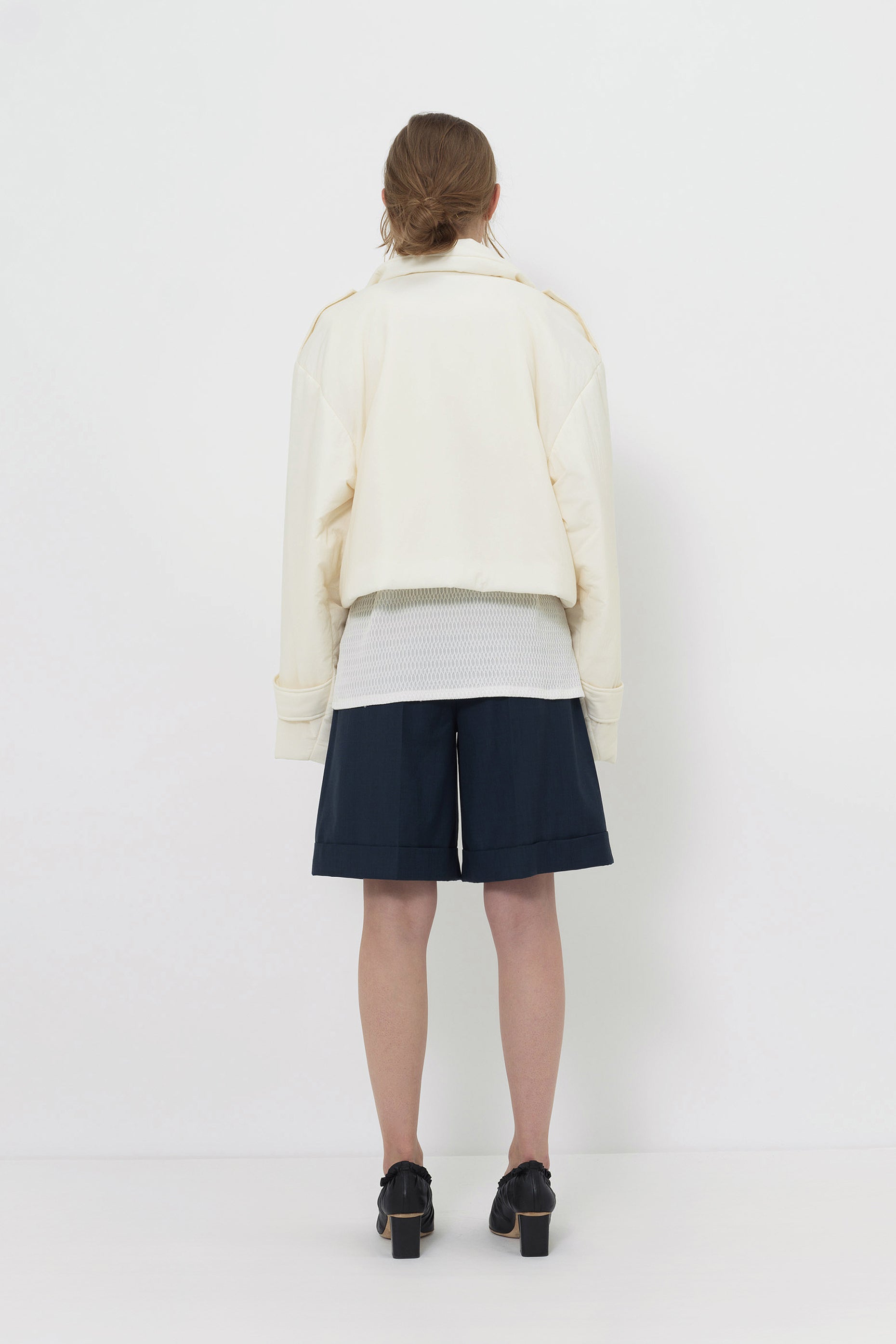 Design: Cropped cut with high collar, oversized fit, and snap-button front closure
