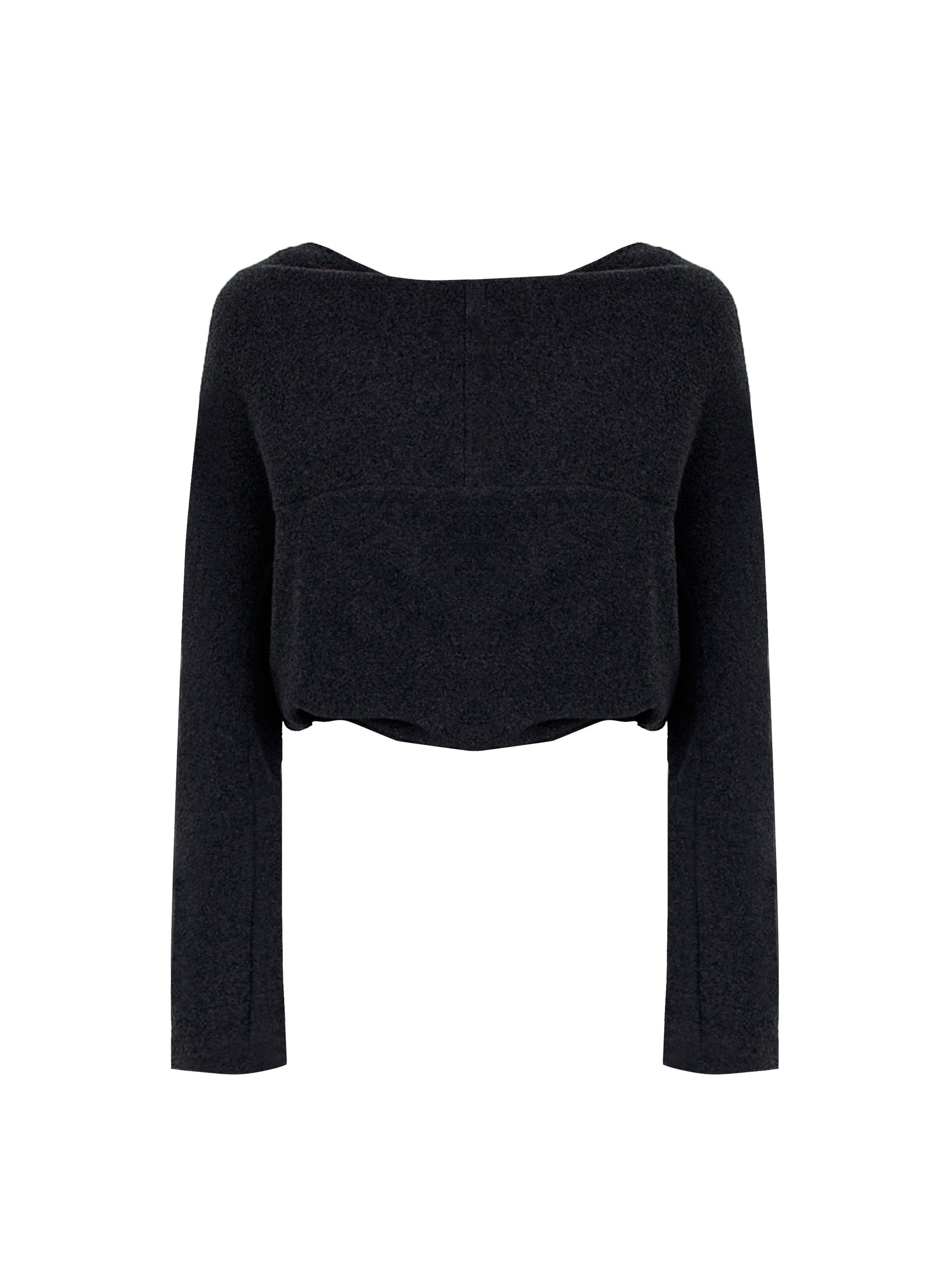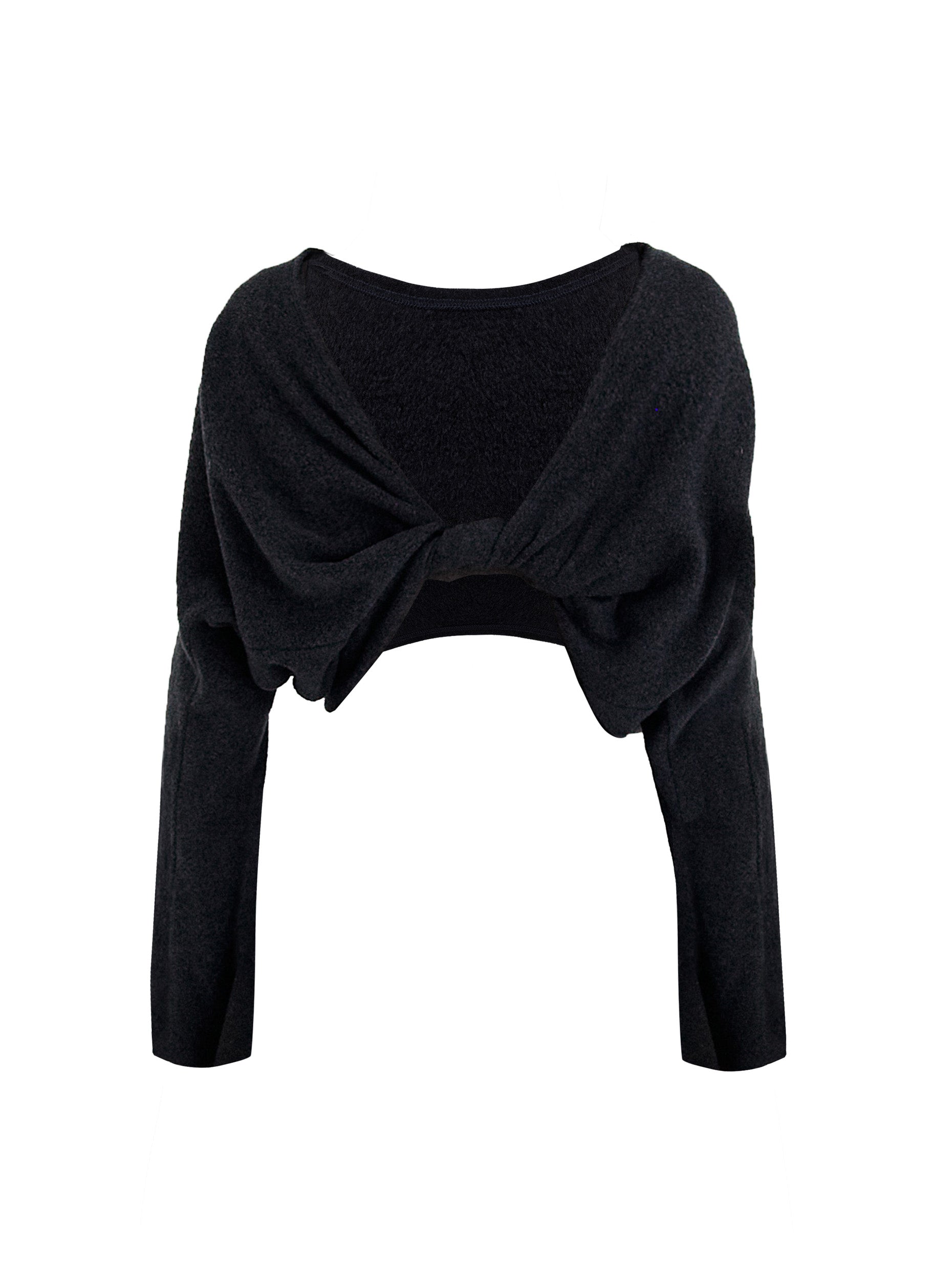 Crafted from a soft and cozy fleece fabric, this piece is lightweight, fluffy, and gentle against the skin. The relaxed poncho-style cut features extra-long sleeves that reach the hands, while the back is designed with a twisted knot detail. It can be worn front or back, offering the option of an avant-garde asymmetric look or a wrapped shawl-like silhouette. Effortlessly layered over fitted knits, shirts, and more, it serves as a distinctive highlight in autumn and winter styling.