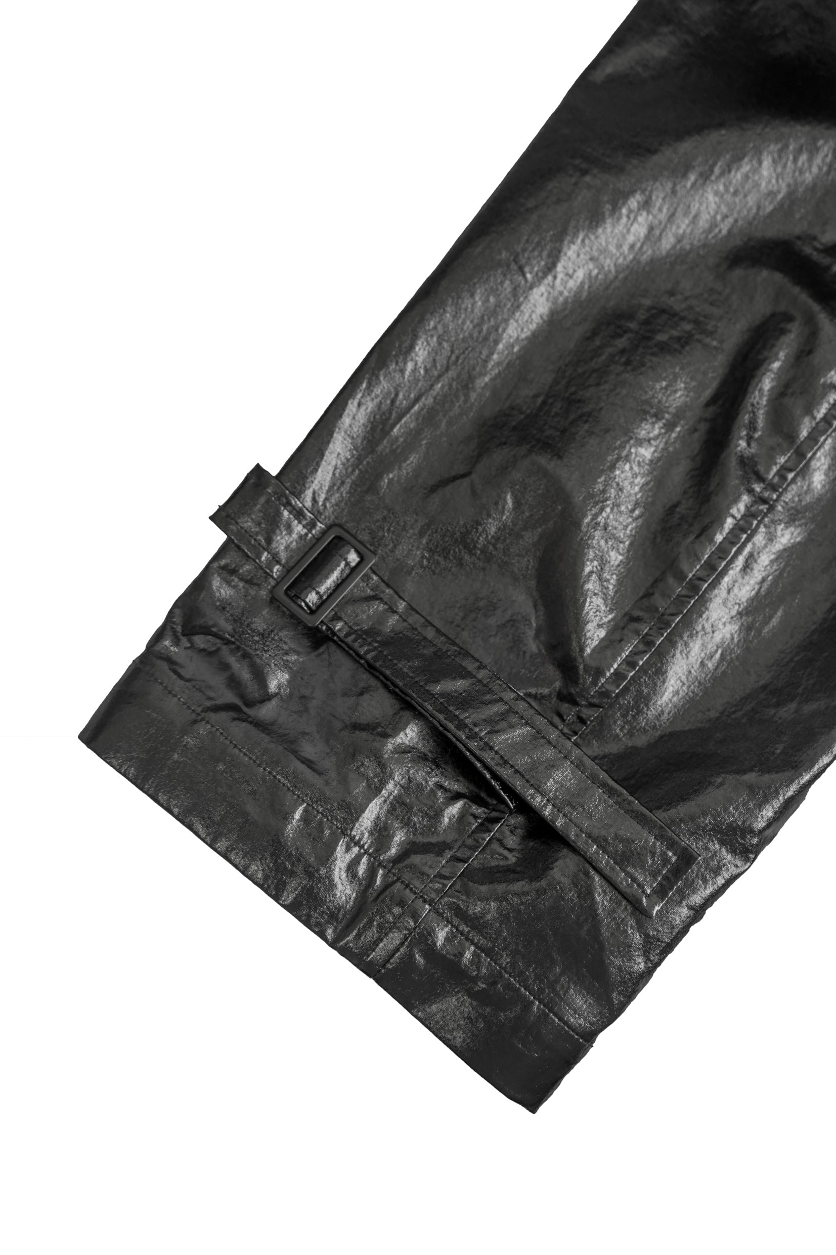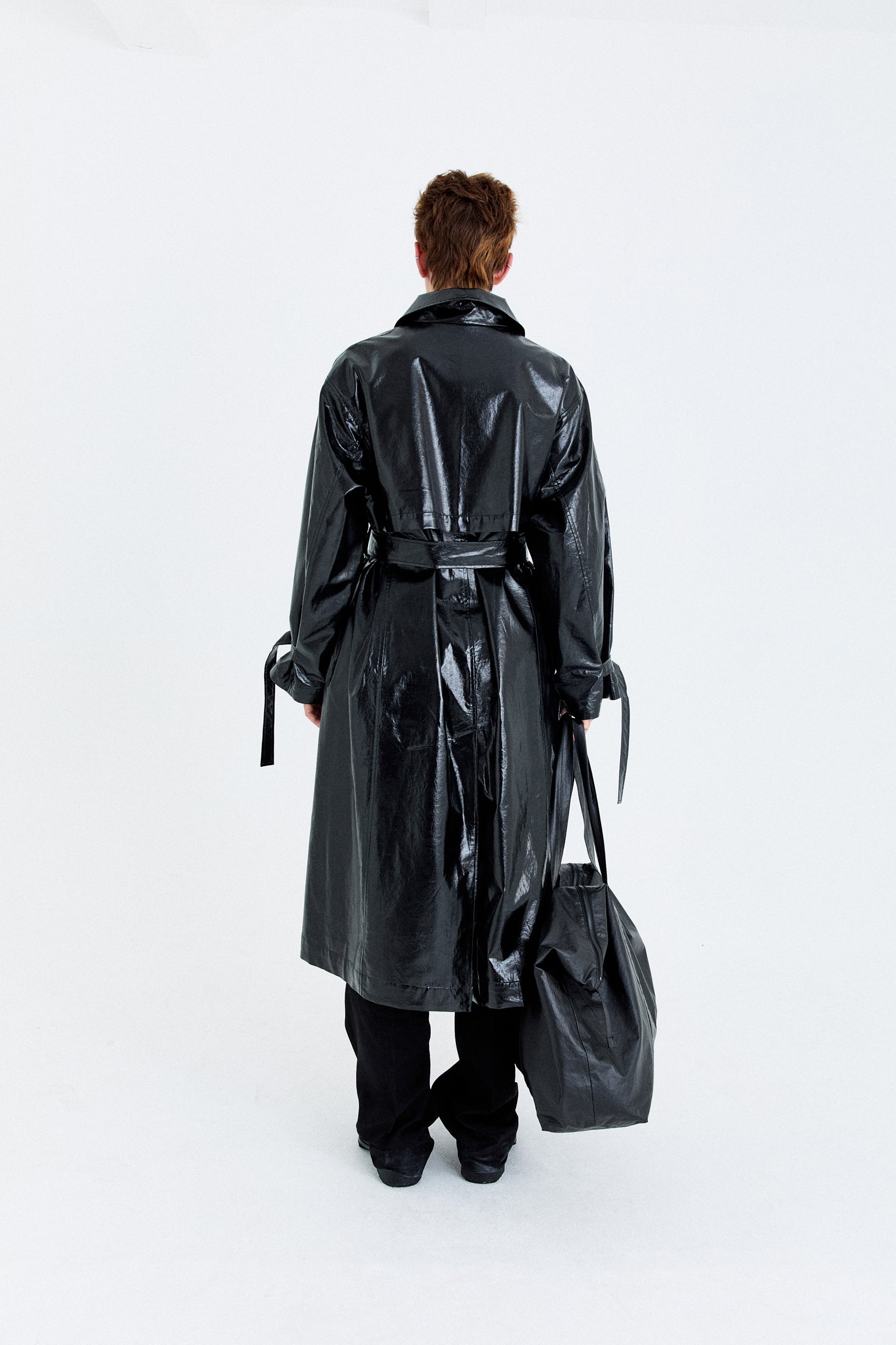 This long black trench coat is crafted from a glossy water repellent coating that gives it a shinny glossy finish. With a structured silhouette and relaxed fit, it features a belt and tie-cuff sleeves, combining functionality with urban sophistication.