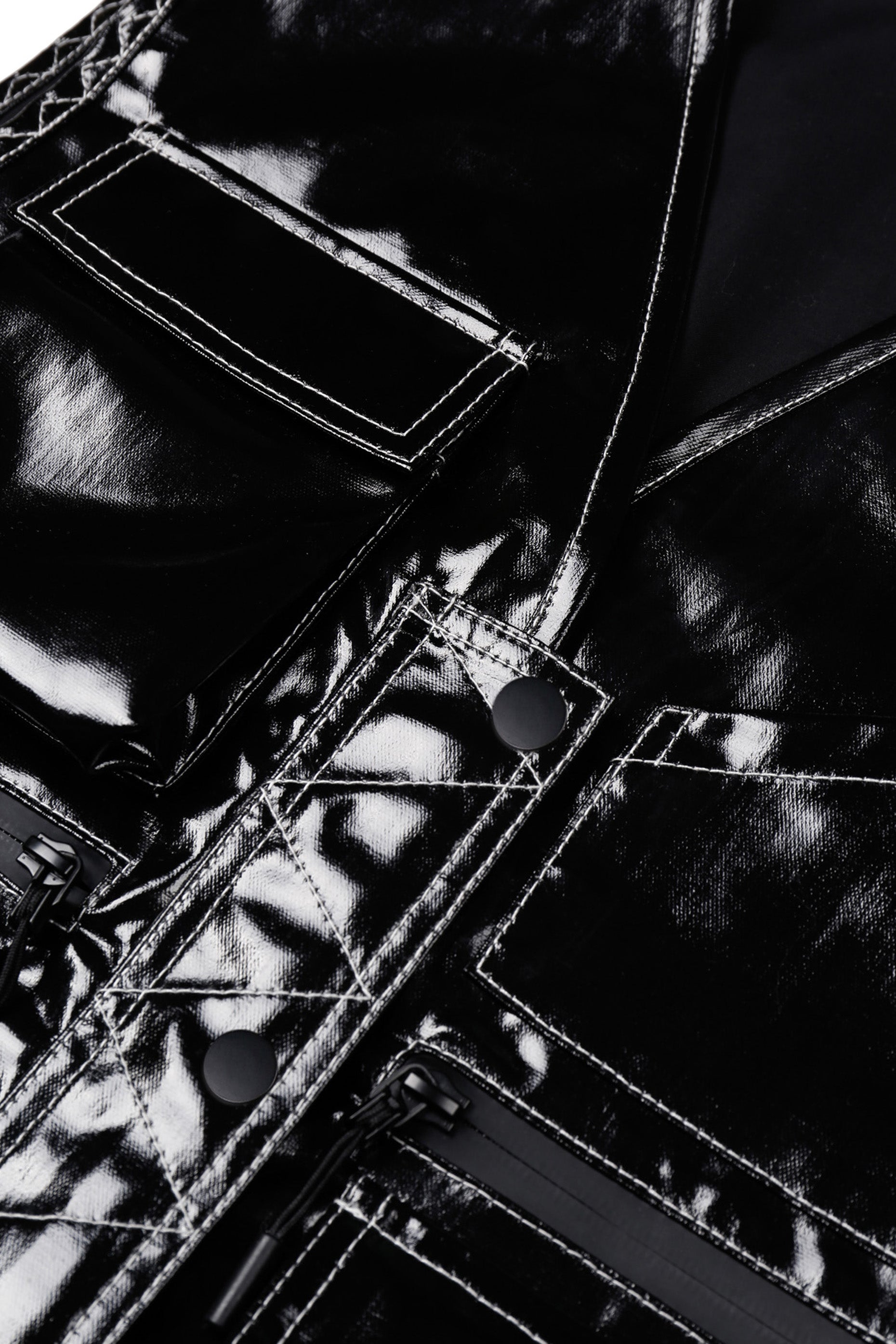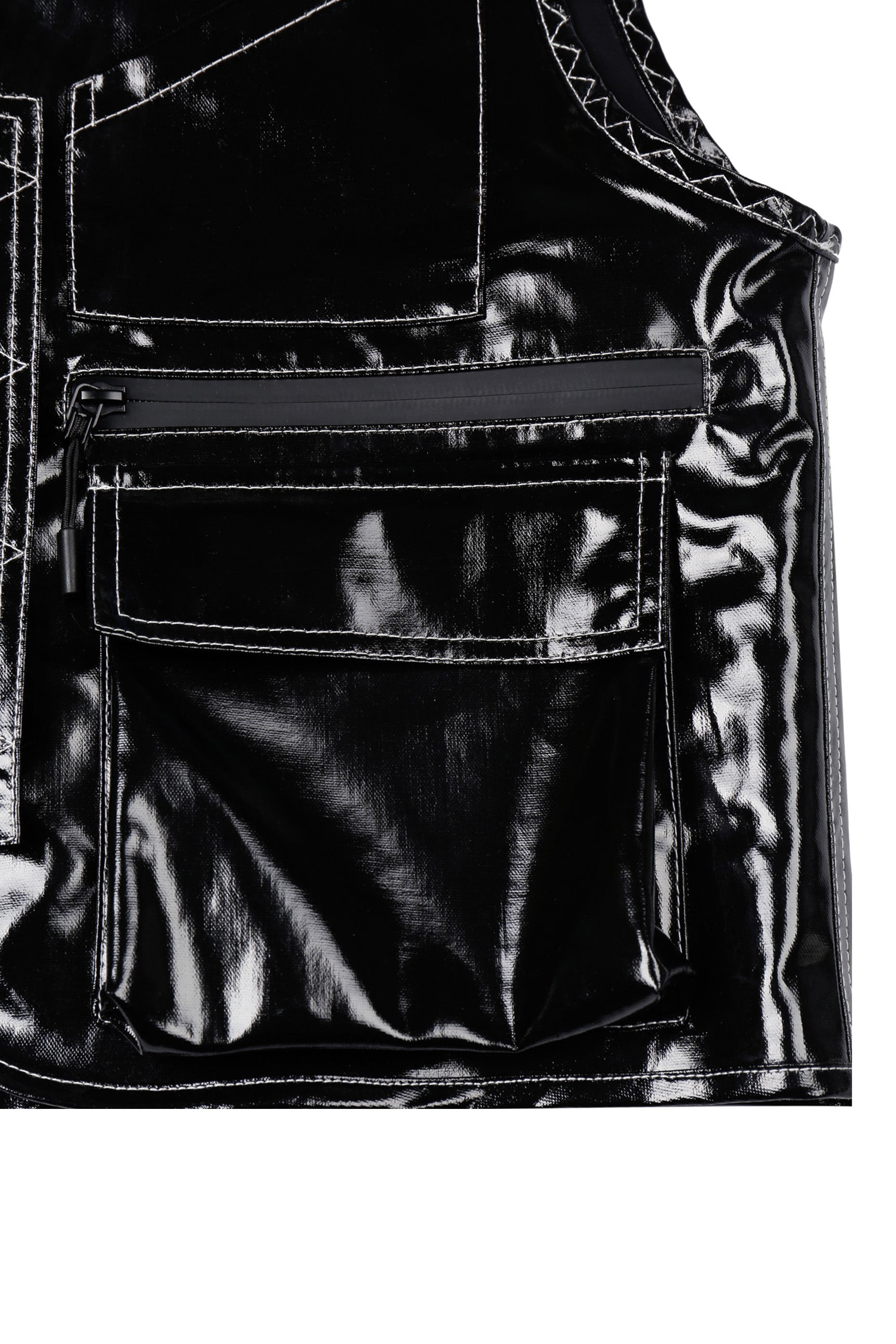 Utility-inspired vest with a glossy, coated finish, featuring front snap-on button closure and multiple practical pockets.