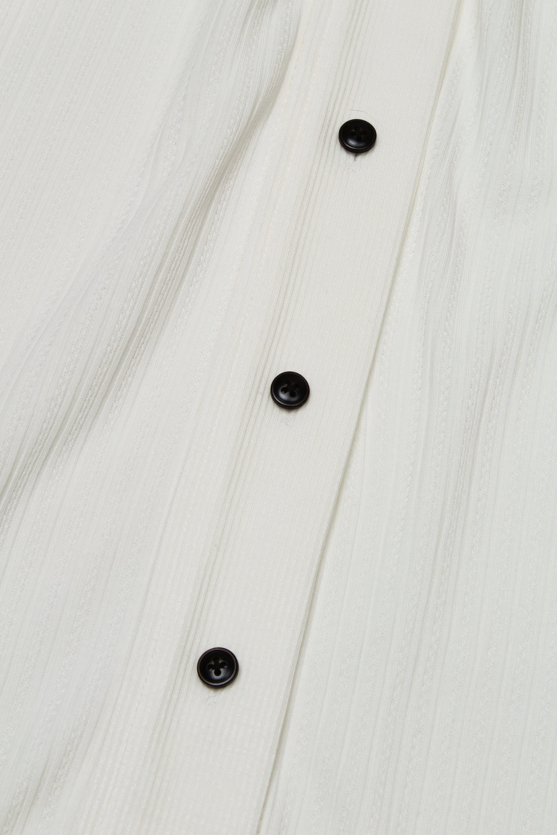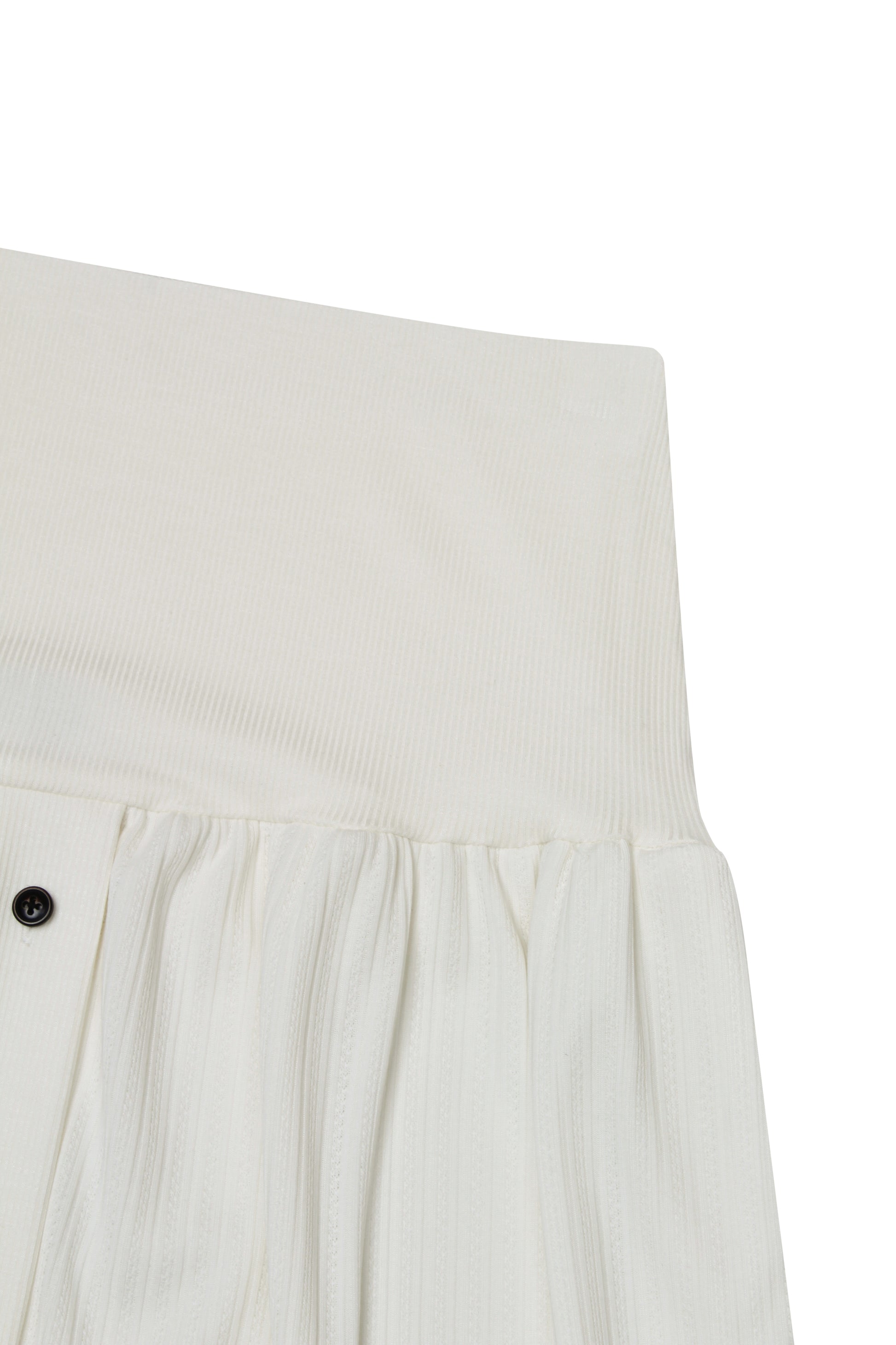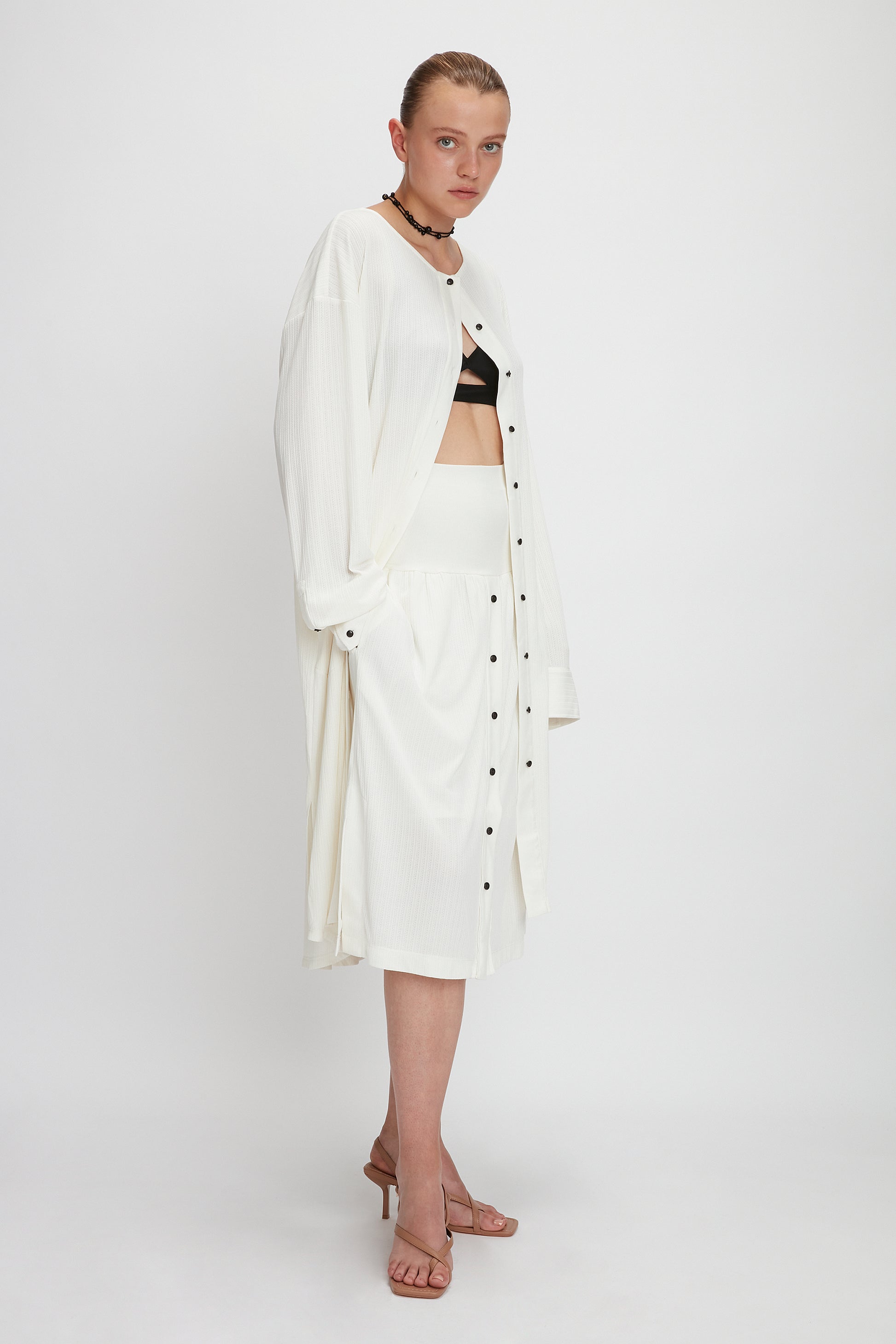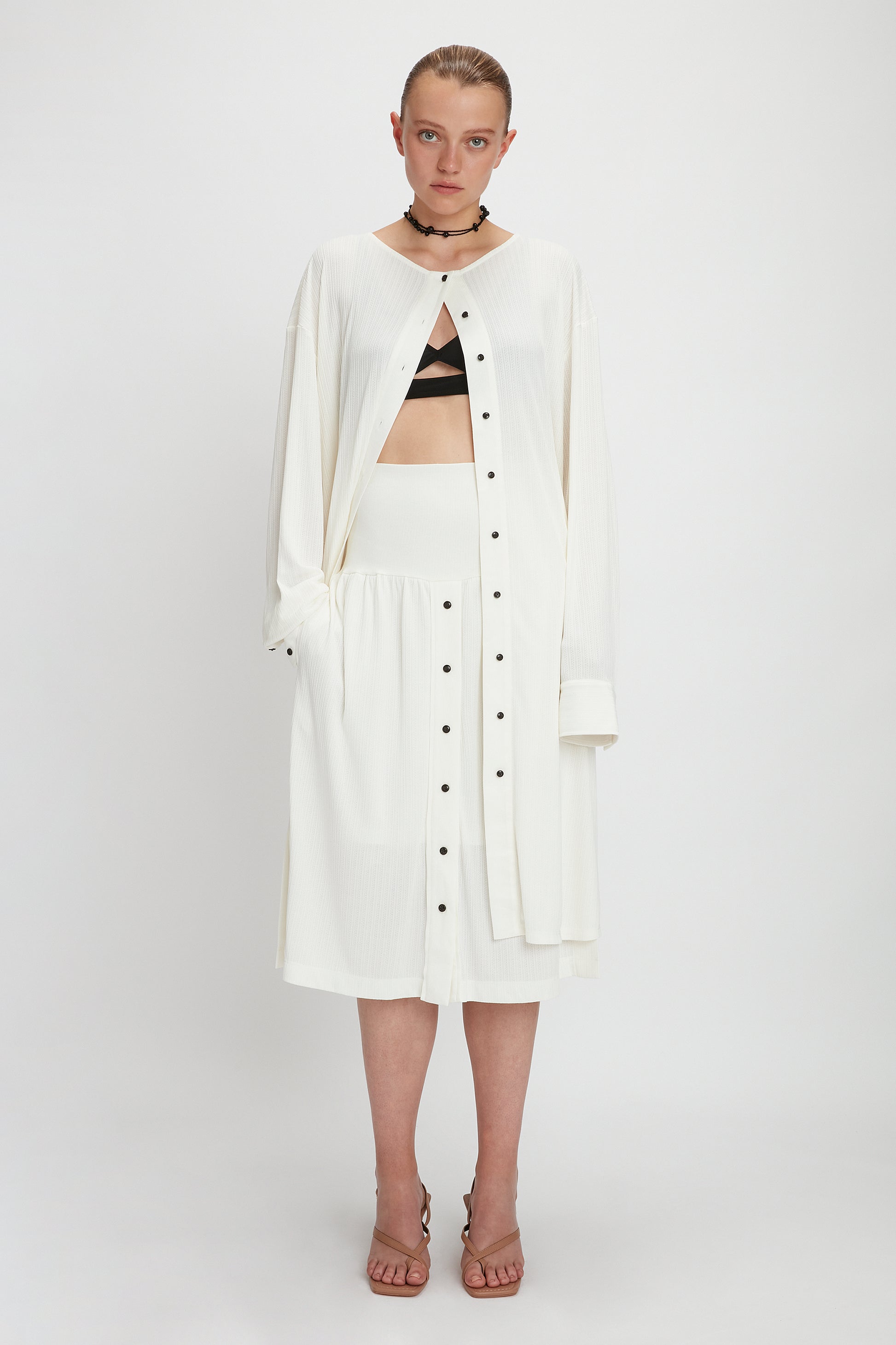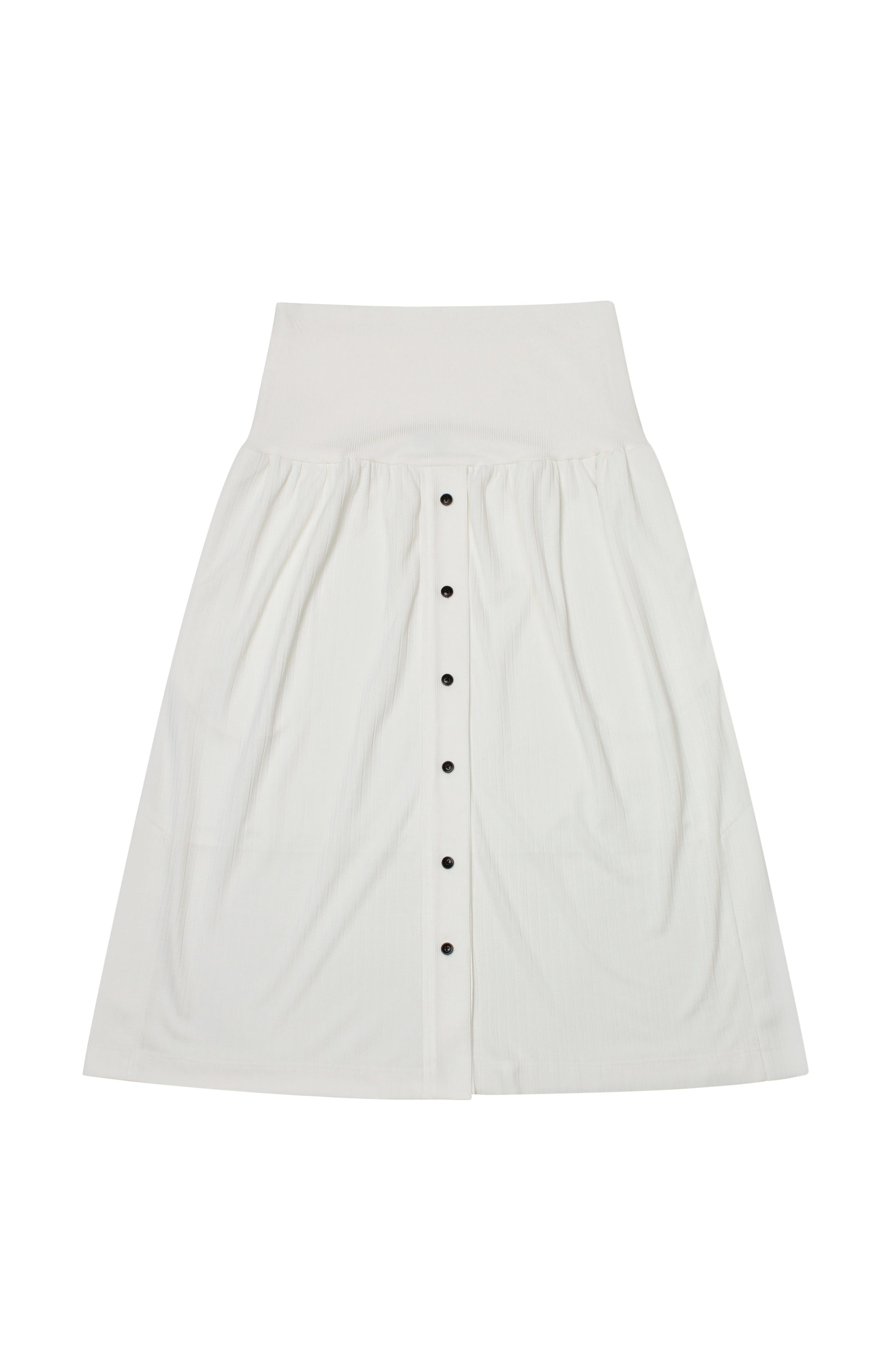YIBRI white button-up skirt is complete with 2 insert pockets. Cut to a knee length and high waist.