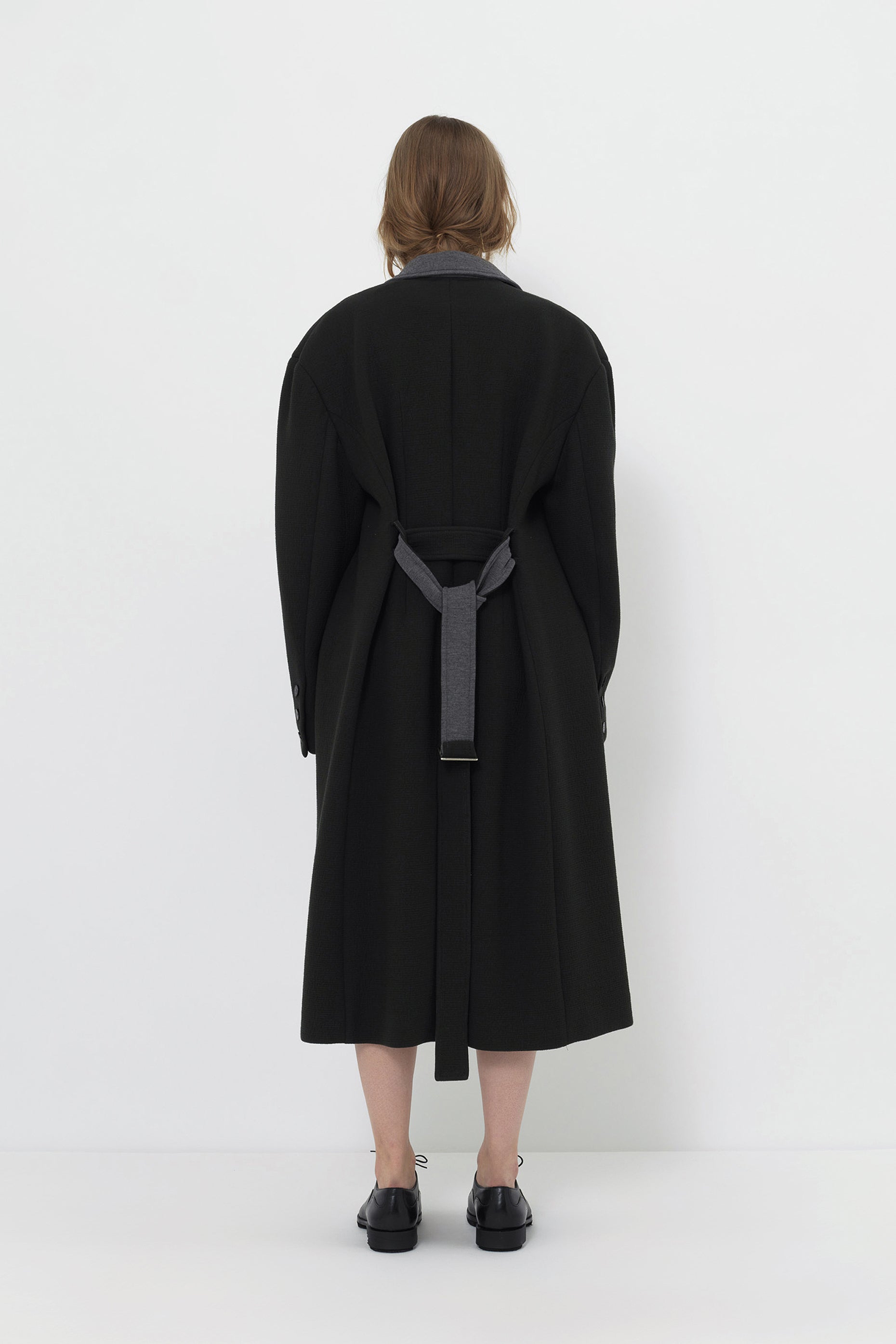Crafted from a double-faced knitted fabric, this oversized coat combines durability and softness with a hint of stretch for ultimate comfort and versatility. The relaxed silhouette and clean lines are enhanced by a contrasting grey notched collar, offering a sophisticated yet contemporary edge to this wardrobe essential.