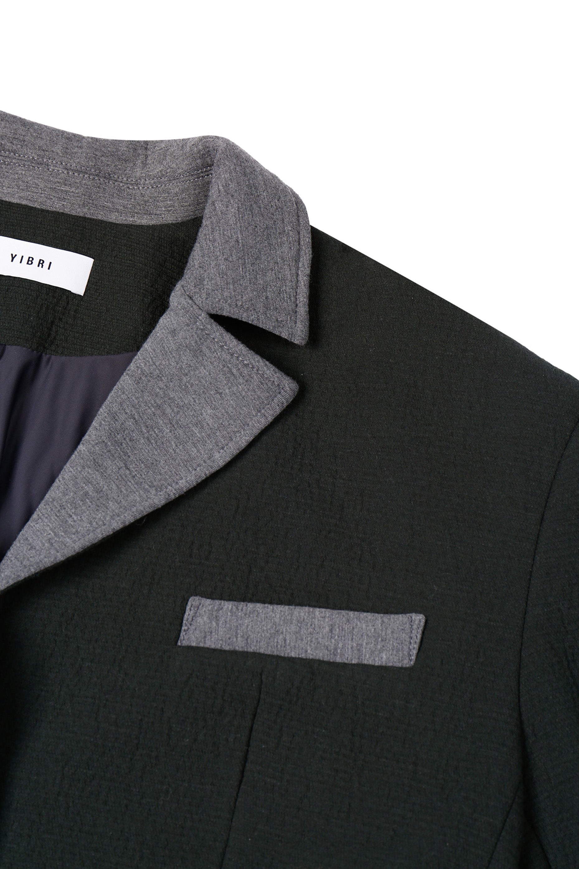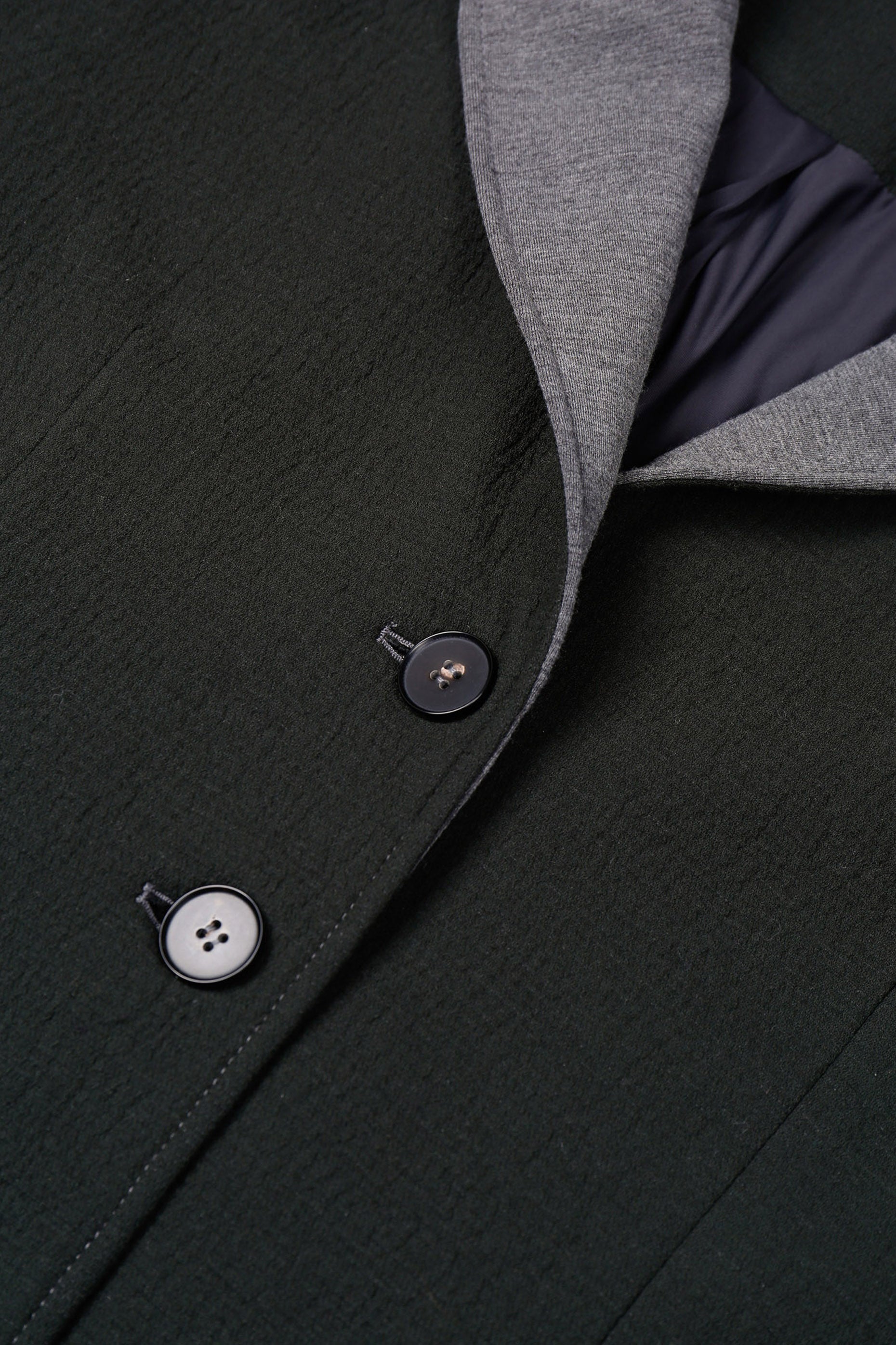 Design: Relaxed oversized fit, grey contrast collar, double-face knitted fabric, and button-front closure