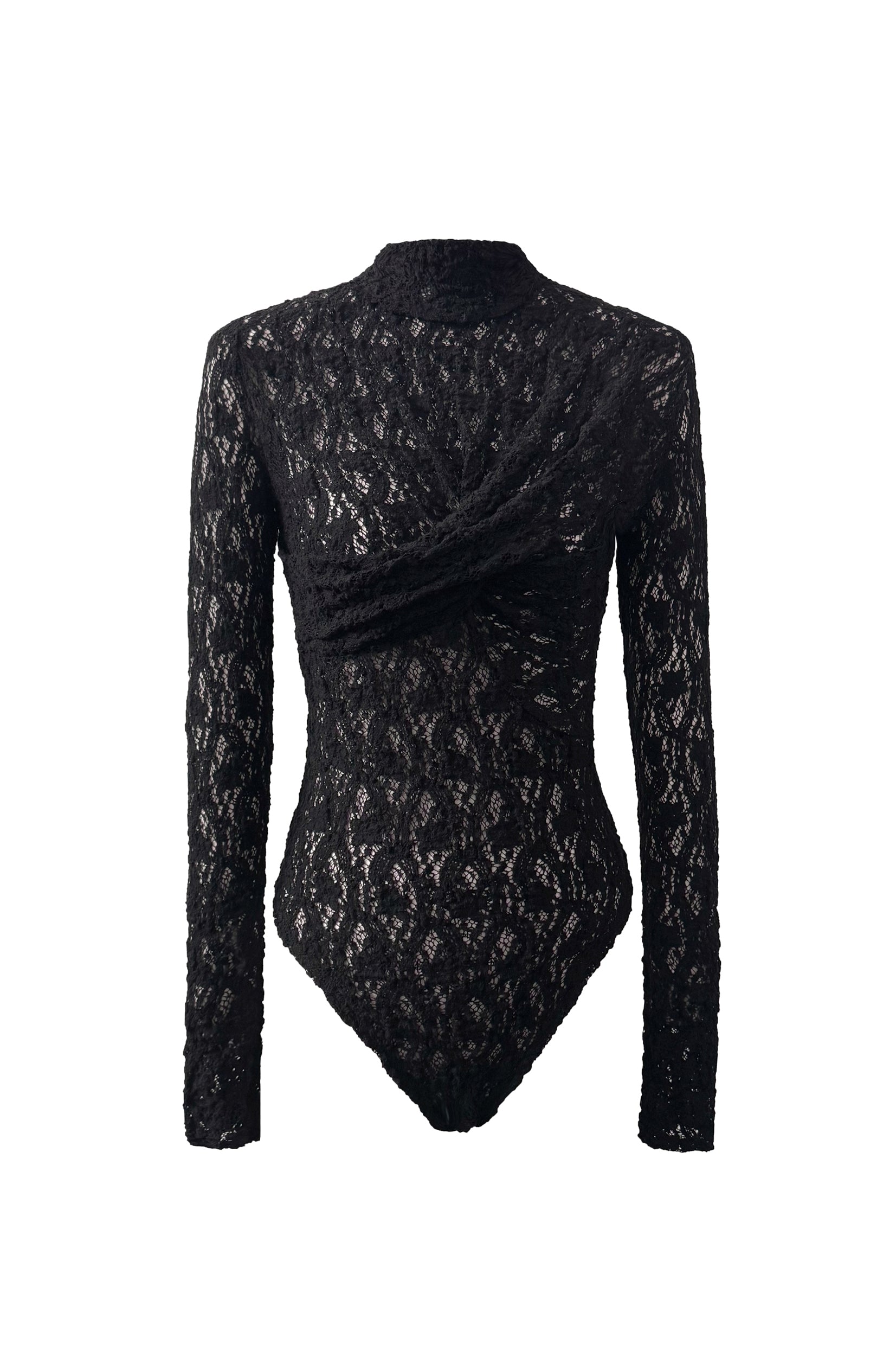 This bodysuit fuses deconstructed silhouettes with romantic lace, creating a visual interplay of edge and softness. Made from all-over stretch lace, it's lightweight and form-fitting, subtly revealing texture against the skin. The front features diagonal asymmetric cuts that break convention and add layered depth. A high neckline and close fit balance structure with delicacy, while the bold oval cut-out at the back introduces negative space, emphasizing the contours and strength of the female back.