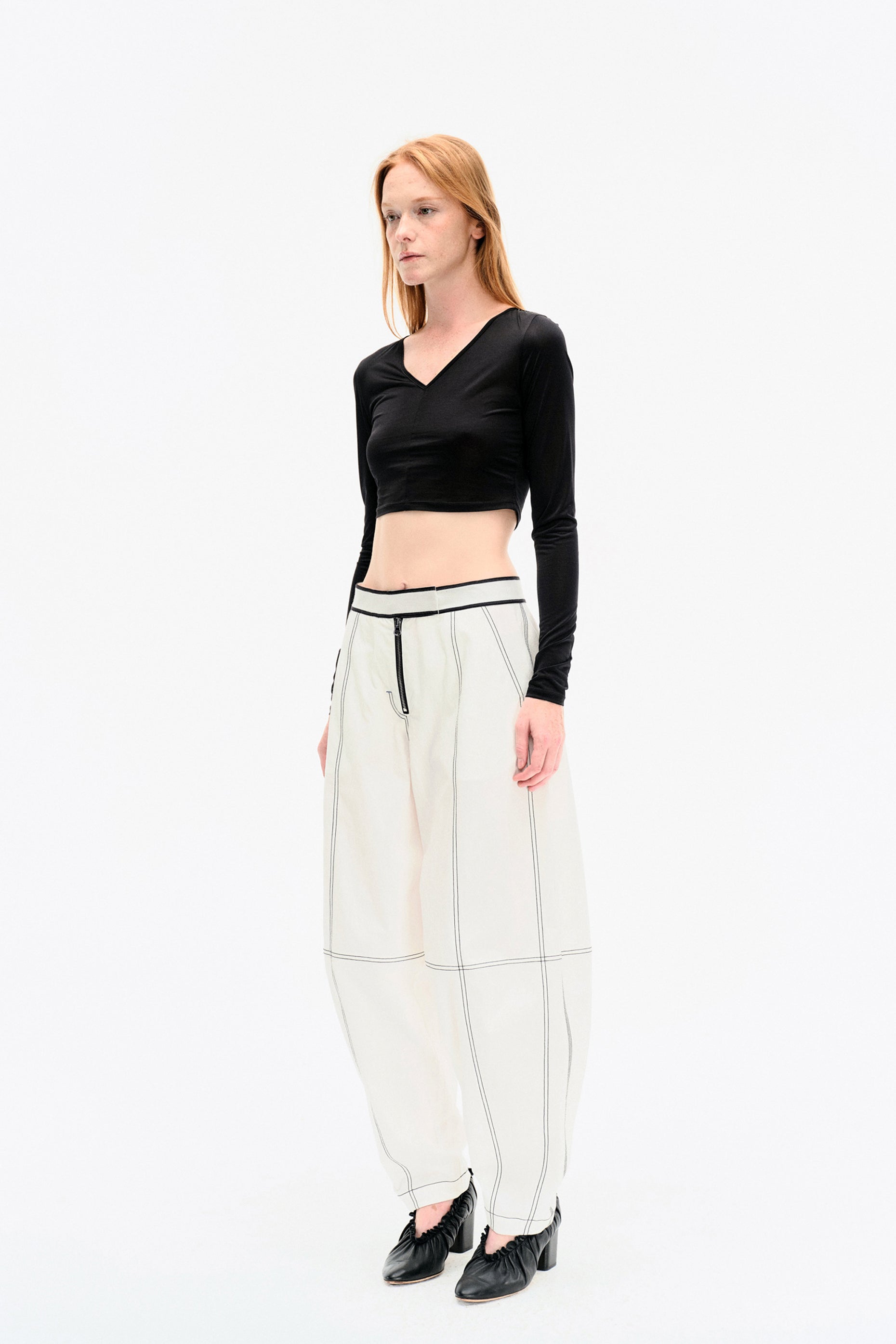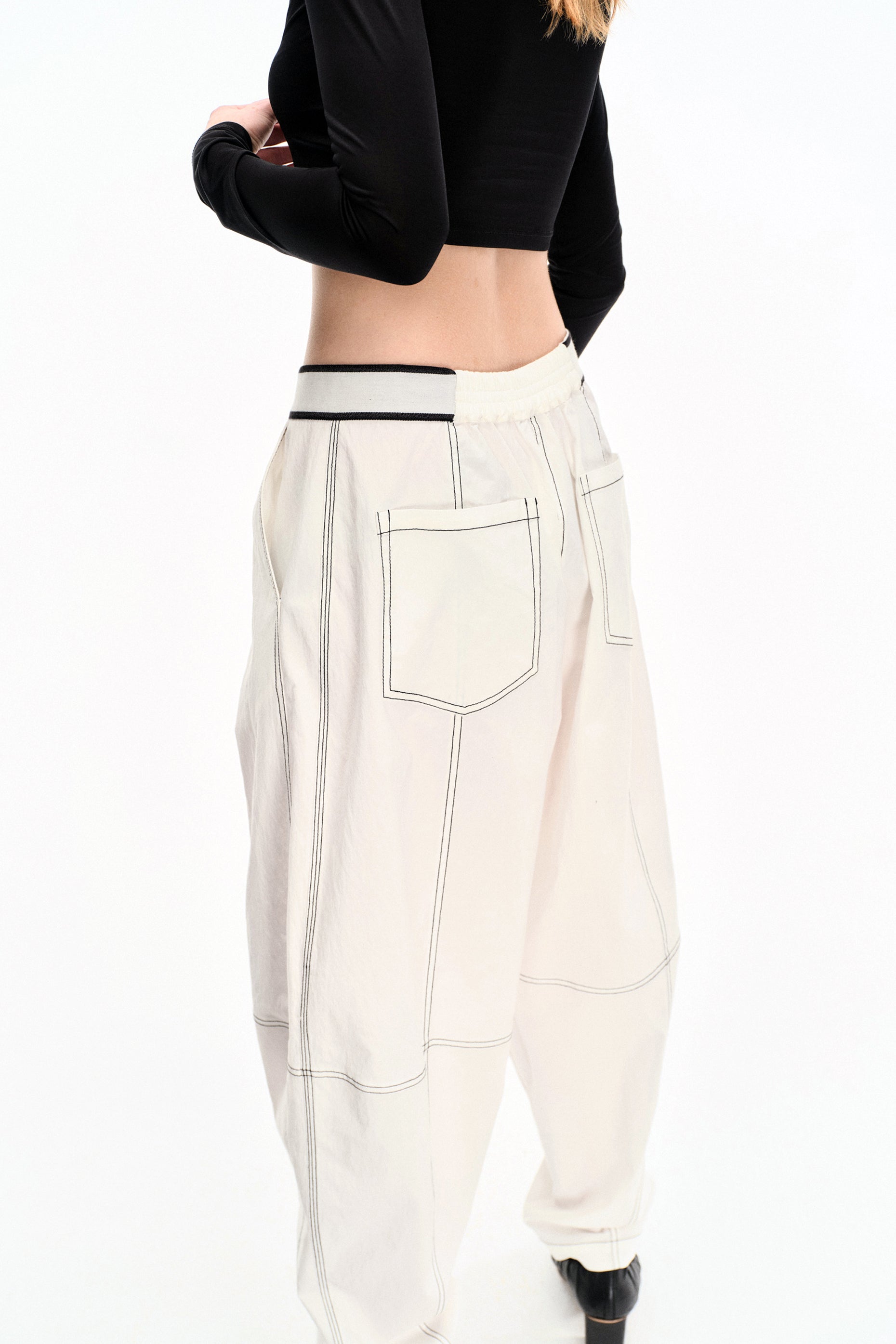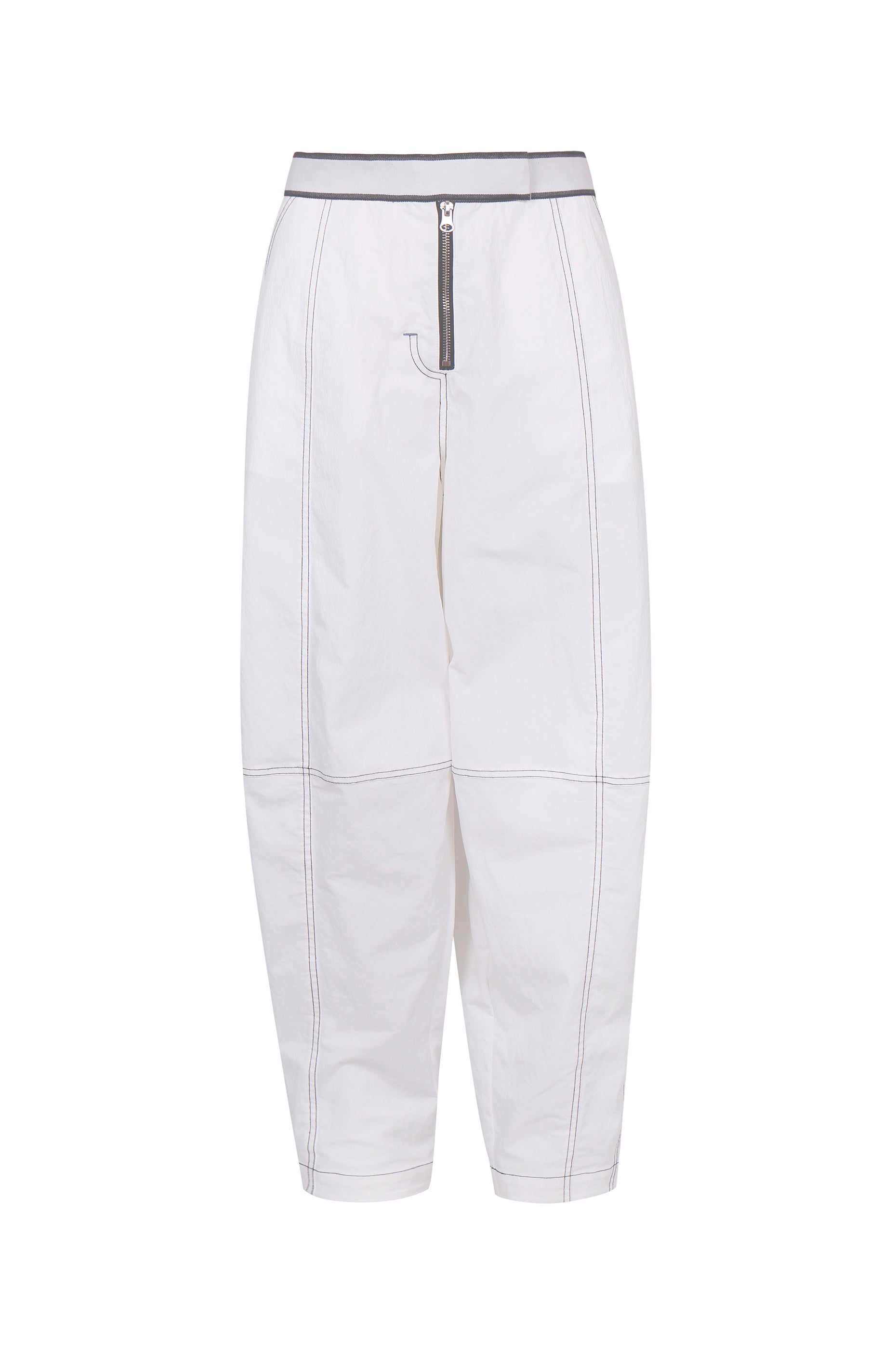 Crafted from 100% cotton, these white trousers feature a soft washed texture and bold black contrast stitching. The high-rise, relaxed fit tapers at the leg for a clean silhouette. Finished with an elastic back waist, exposed front zip, and functional patch pockets.