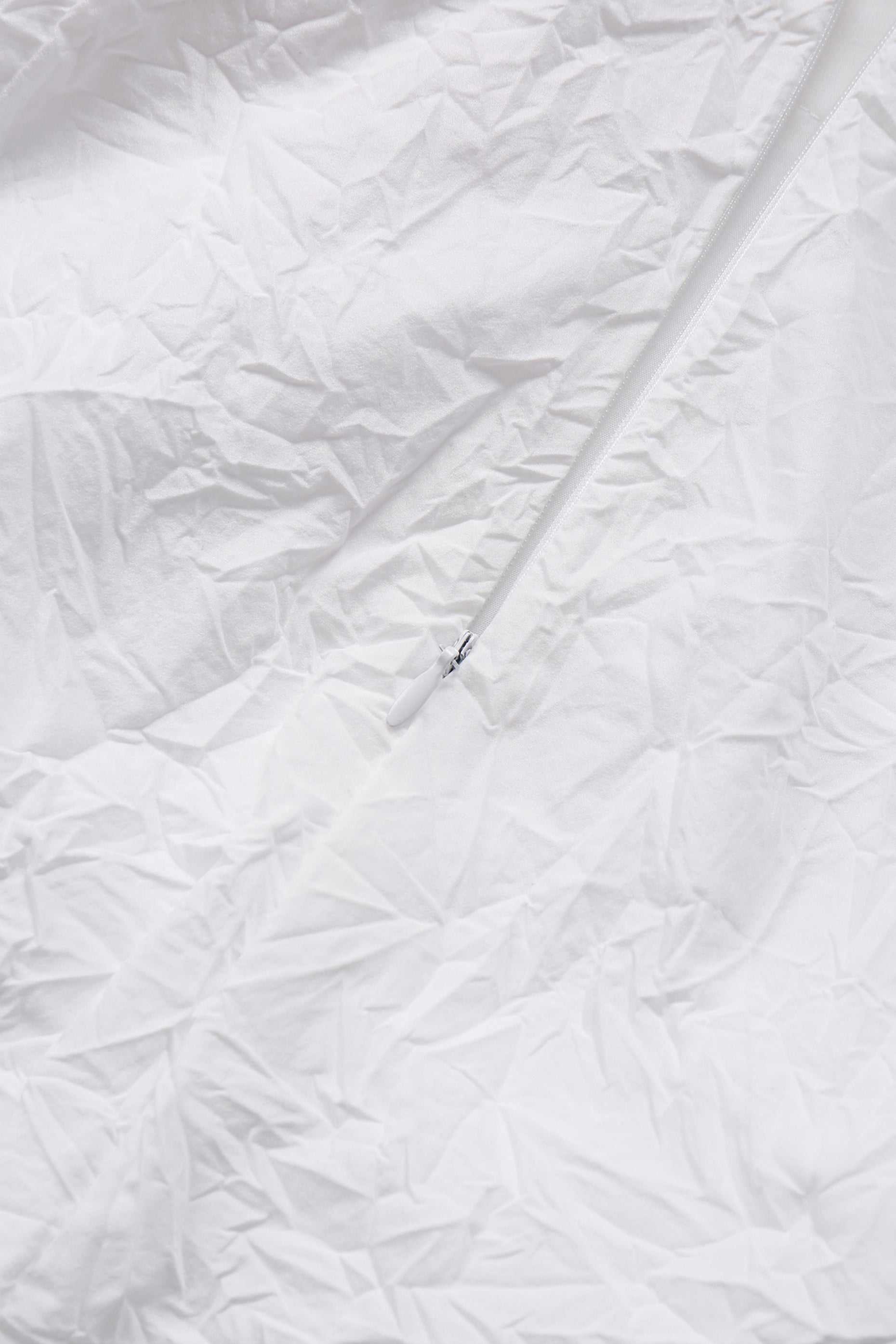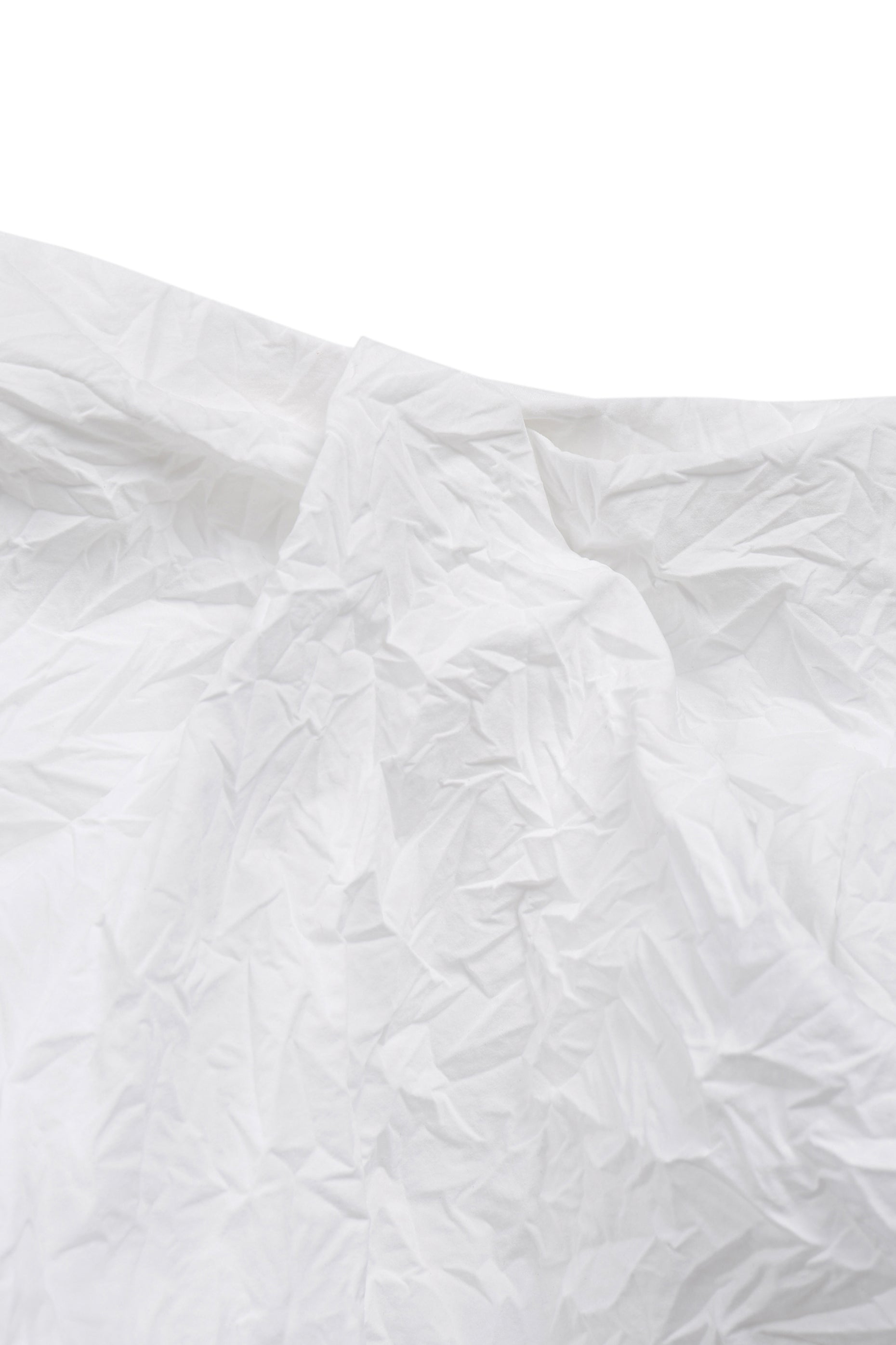 This high-waisted midi skirt features random pleats inspired by the spontaneous wrinkles that form when garments emerge from the laundry machine. The crisp, lightweight fabric offers a structured yet effortless silhouette with a touch of playfulness.