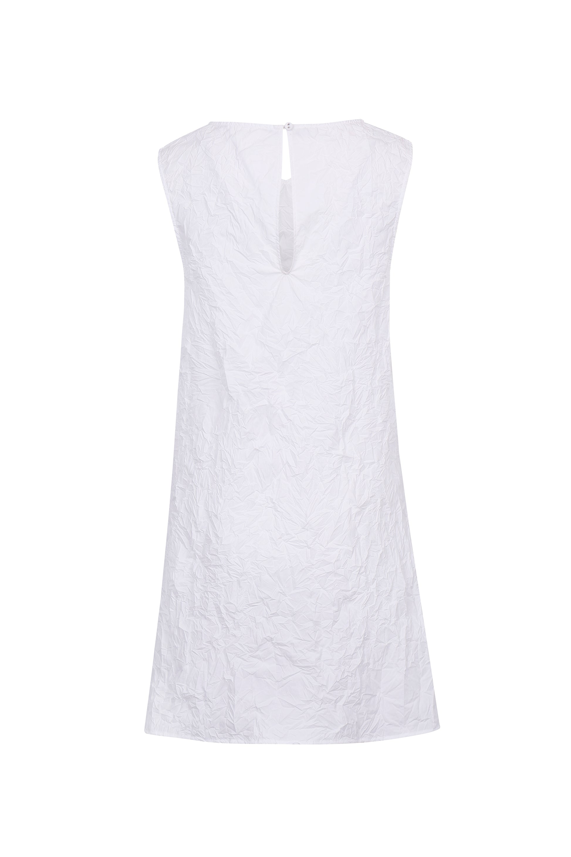 The WHITE TEXTURED DRAPED MINI DRESS crafted from lightweight, crinkled polyester, featuring all-over pleating inspired by the natural wrinkles found in fabric after laundry. The asymmetric front drape adds sculptural dimension, balancing the minimal silhouette with textural interest.