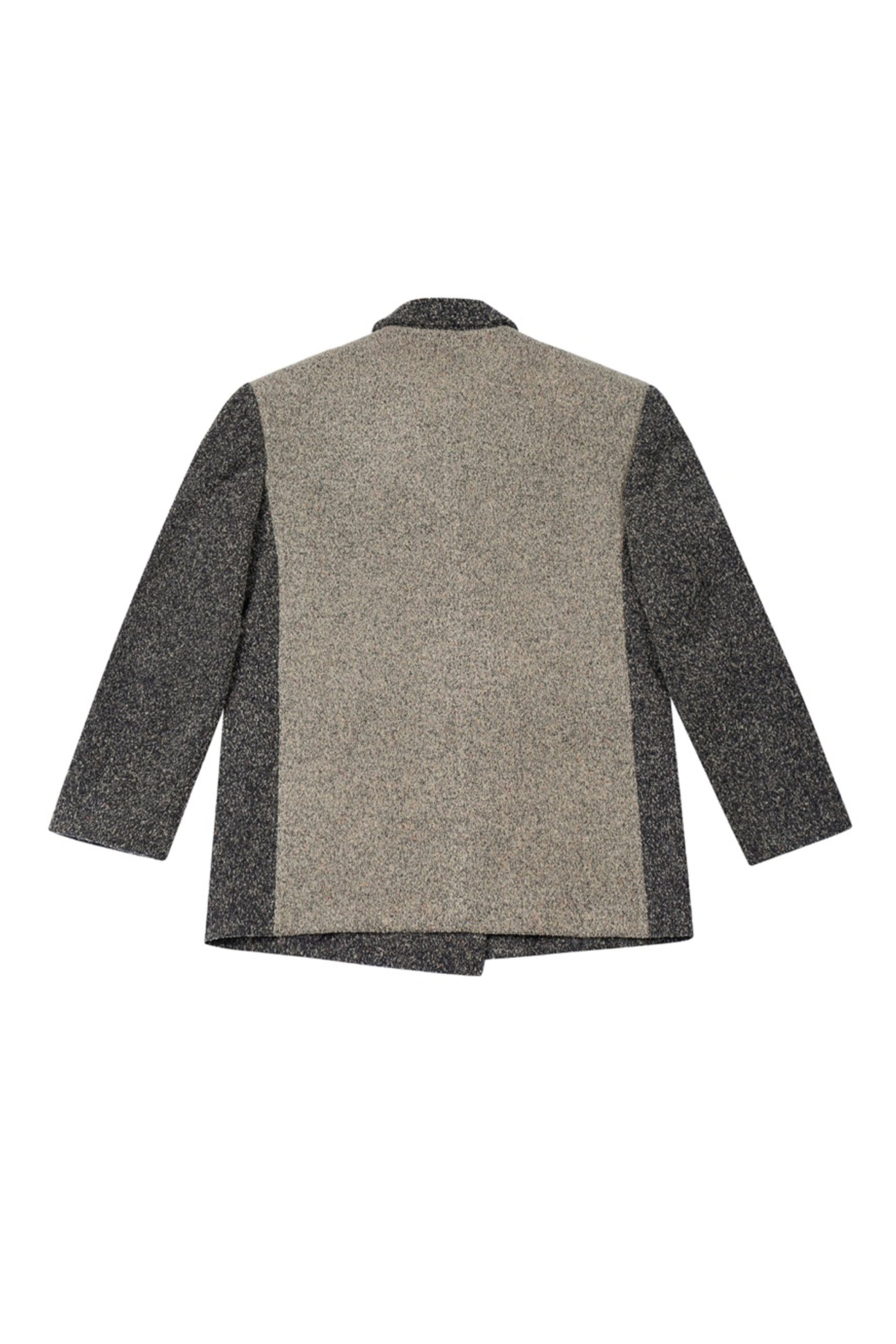 Designed with an intentionally oversized fit, it sits slightly away from the body to create a sculptural, boxy profile. Clean shoulders, a wide lapel line, and a straight hem sharpen the silhouette, while subtle internal shaping maintains ease without losing refinement. The contrast panel at the back adds a considered shift in tone and texture, giving the piece a distinctive architectural quality.